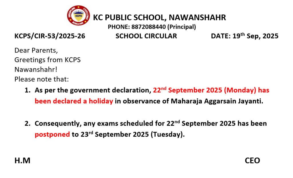 Holiday in observance of Maharaja Aggarsain Jayanti. circular Holiday in observance of Maharaja Aggarsain Jayanti. admKCPSnsrADMIN September 19, 2025 54 views
