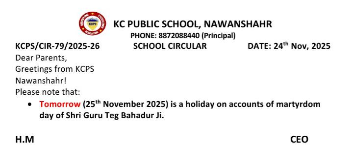 Holiday on accounts of martyrdom day of Shri Guru Teg Bahadur Ji.