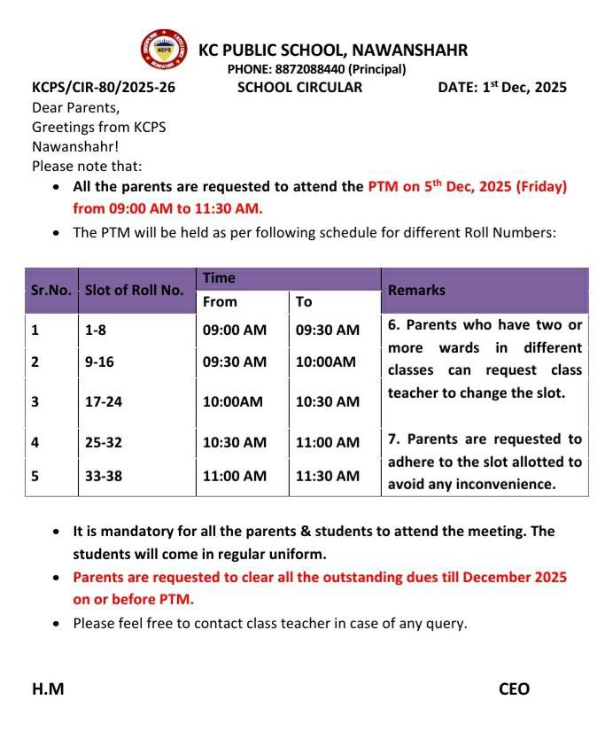 PTM on 5th Dec, from 09:00 AM to 11:30 AM. circular PTM on 5th Dec, from 09:00 AM to 11:30 AM. admKCPSnsrADMIN December 1, 2025 6 views