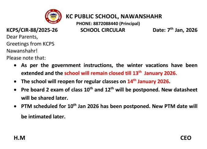 School will remain closed till 13th January 2026. circular School will remain closed till 13th January 2026. admKCPSnsrADMIN January 8, 2026 30 views
