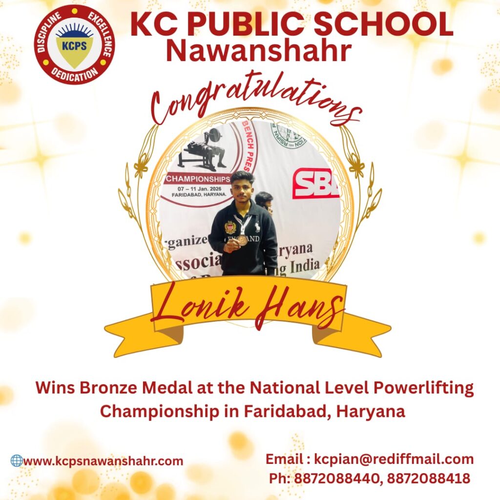 Lonik Hans Wins Bronze Medal Event Lonik Hans Wins Bronze Medal admKCPSnsrADMIN January 15, 2026 17 views Wins Bronze Medal at the National Level Powerlifting Championship in Faridabad, Haryana