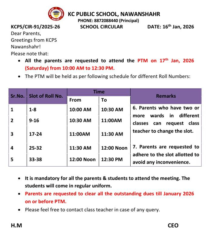 PTM on 17th Jan, 2026(Saturday) from 10:00 AM to 12:30 PM. circular PTM on 17th Jan, 2026(Saturday) from 10:00 AM to 12:30 PM. admKCPSnsrADMIN January 16, 2026 32 views