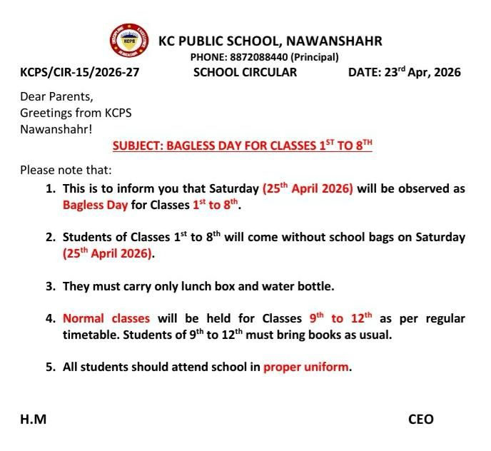 BAGLESS DAY FOR CLASSES 1st TO 8th circular BAGLESS DAY FOR CLASSES 1st TO 8th admKCPSnsrADMIN April 23, 2026 4 views